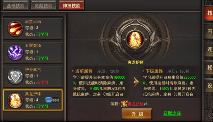 2.新增--通用神技真龙护体,增加生命,使用技能时清除麻痹、定身状态,并有几率触发真龙护体,免疫麻痹、定身3秒,技能等级越高,真龙护体触发几率越大,3级技能时可开启自动开启释放,被麻痹、定身时自动释放,无延迟;
