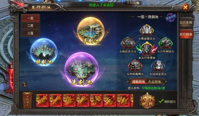 2. 场景内可自由pk,会有死亡掉落;低于1亿战力可自由进入超脱或凡尘剑池,高于1亿战力进入凡尘剑池将会受到压制“血量、攻击、防御降低80% 每层剑池进入需要轩辕剑达到一定等阶,boss掉率层数越高,剑池进入需求越高,掉落越丰富。