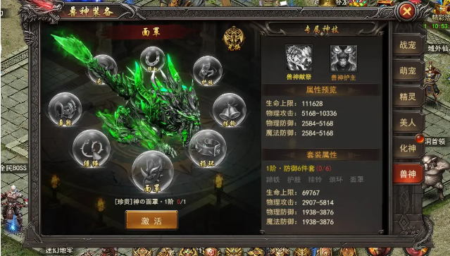 1. 今天给大家介绍的王者之心2兽神装备,战宠-兽神装备,开服100天开启,兽神装备兑换:可通过碎片兑换成品道具。