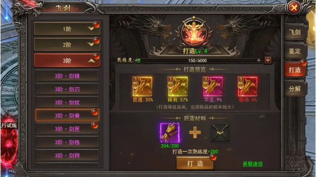 2.飞剑装备阶数越高的装备,鉴定时的属性上限越高;飞剑系统--打造功能:分为8个部位,每个部位需要对应的碎片+剑心进行打造,打造概率出现一种普通、稀有、罕见、极品装备;每次打造会增加熟练度,提升打造等级,打造等级越高,可打造部位阶数越高,出现极品概率越大。