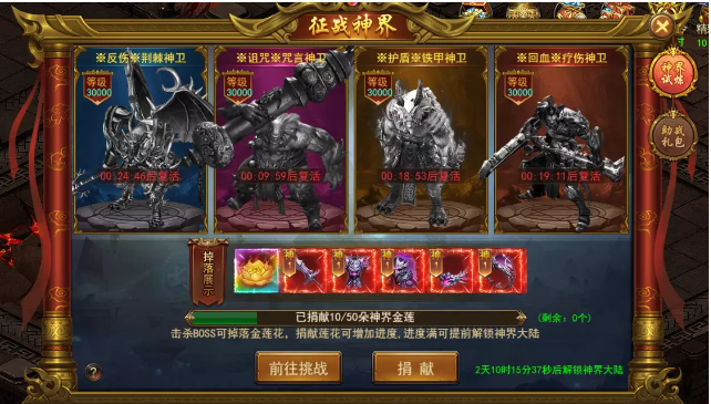 2.征战神界需要个人捐献50朵神界金莲,神界金莲可以通过击杀征战神界的四个BOSS掉落。捐献50个可以提前开启,不然就需要等待三天,先进入的可以抢占先机。