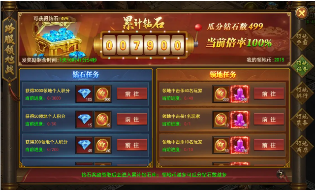 2.钻石任务完成后,获取的钻石会计入累计钻石池;根据自身领地币,与参与行会玩家获取的总的领地币的占比