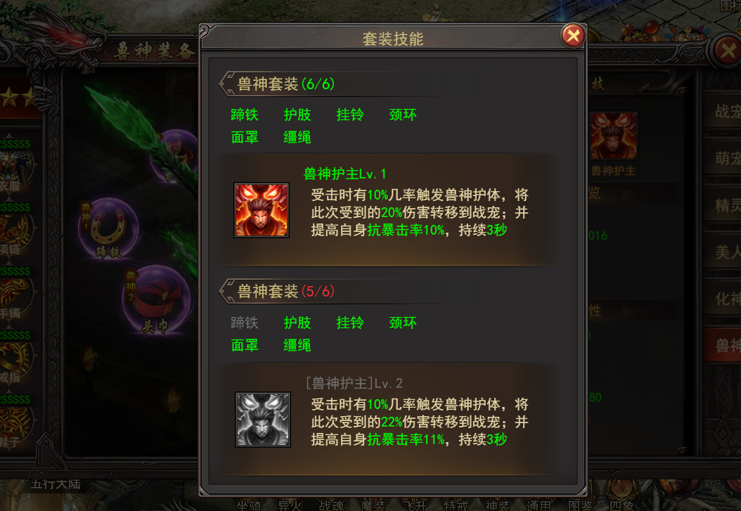 2. 激活面罩、护肢等其他六件装备可以激活兽神另外一个套装技能兽神护住,受攻击时,有记录出发兽神护体,此次收到的伤害百分比转移到战宠,并且提高自身抗暴击率,持续一段时间。