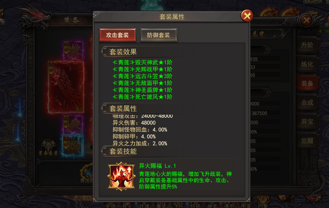 2. 激活之后增加套装属性抑制怪物回血、抑制碎甲、异火之力加成等等,青莲地心火套装技能异火赐福。