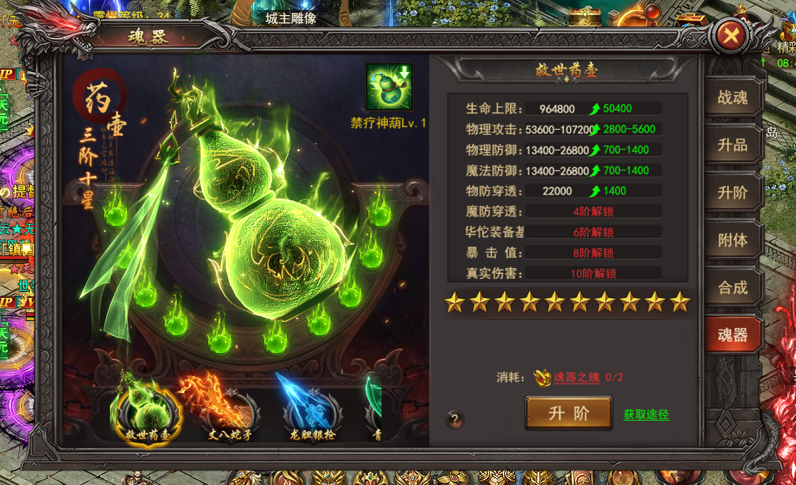 2. 升满10星消耗魂器之魄可以对魂器进行升阶,解锁新的属性词条,获得超高属性加成。