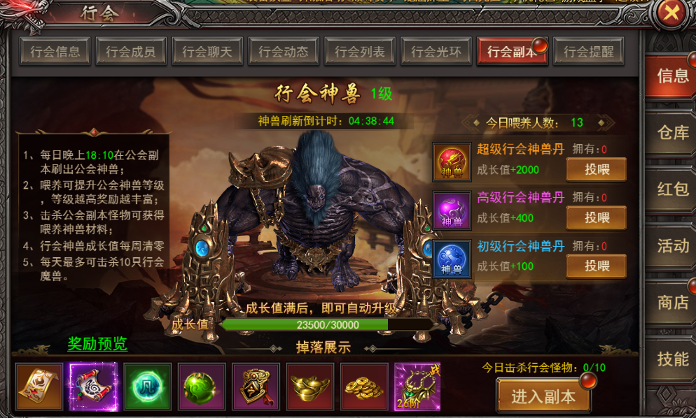 4、喂养材料通过击杀行会怪物获取,每日最多击杀10只