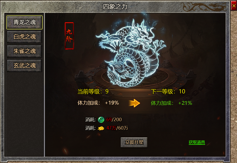 (3)提升四象需要不同的四象丹和绑金,四象丹各个精英和BOSS有几率掉落