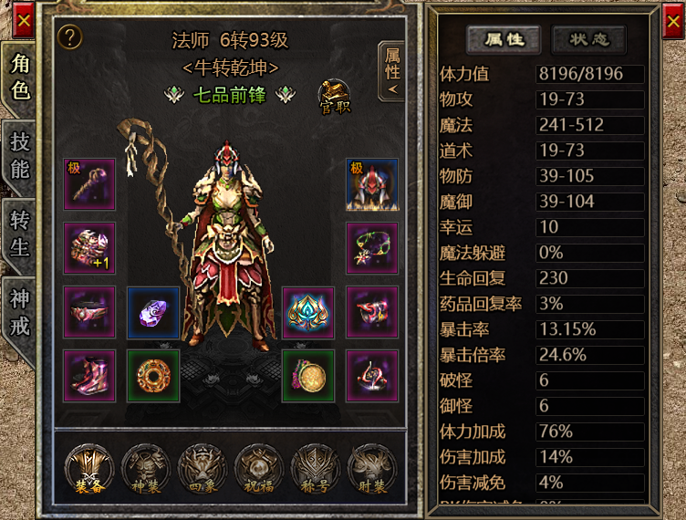 (2)四象青龙可以提升体力加成百分比,白虎神兽可以提升吸血特效,朱雀神兽提供大量物攻、魔法、道术,玄武神兽提升伤害减免效果