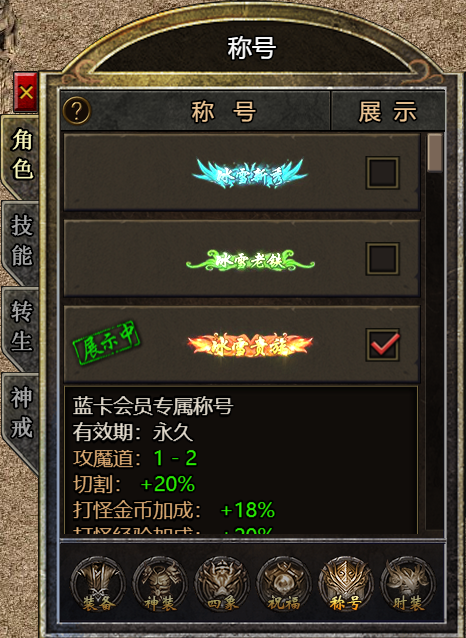 (1)本界面可以查看所有已获得的称号,包括称号介绍、剩余时间、属性和展示效果