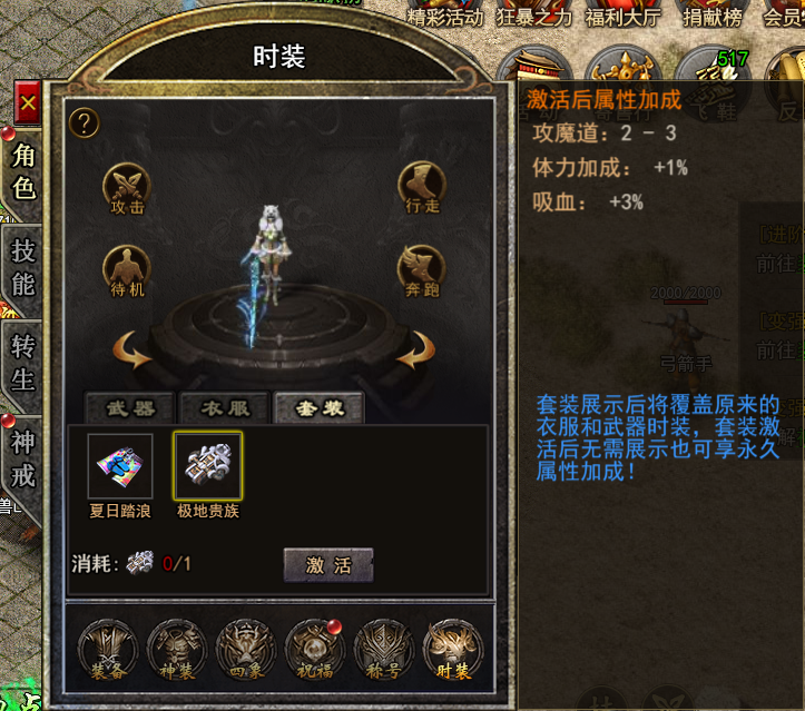 (1)时装分为衣服、武器、套装,需要时装物品激活