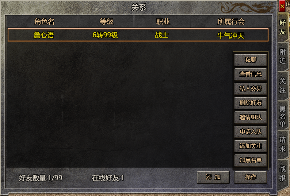 (2)成为好友后,可在该界面进行【私聊】、【查看信息】、【私人交易】、【删除好友】、【邀请组队】、【申请入队】、【添加关注】、【加黑名单】操作