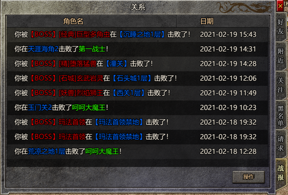 (1)查看近期所有被击败记录,包含被玩家击败和被怪物击败