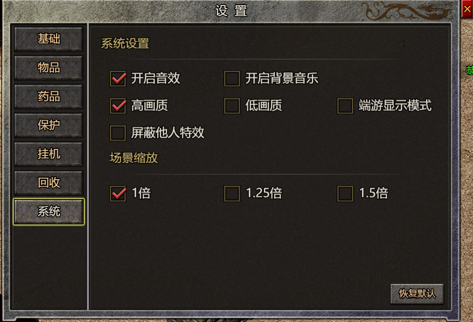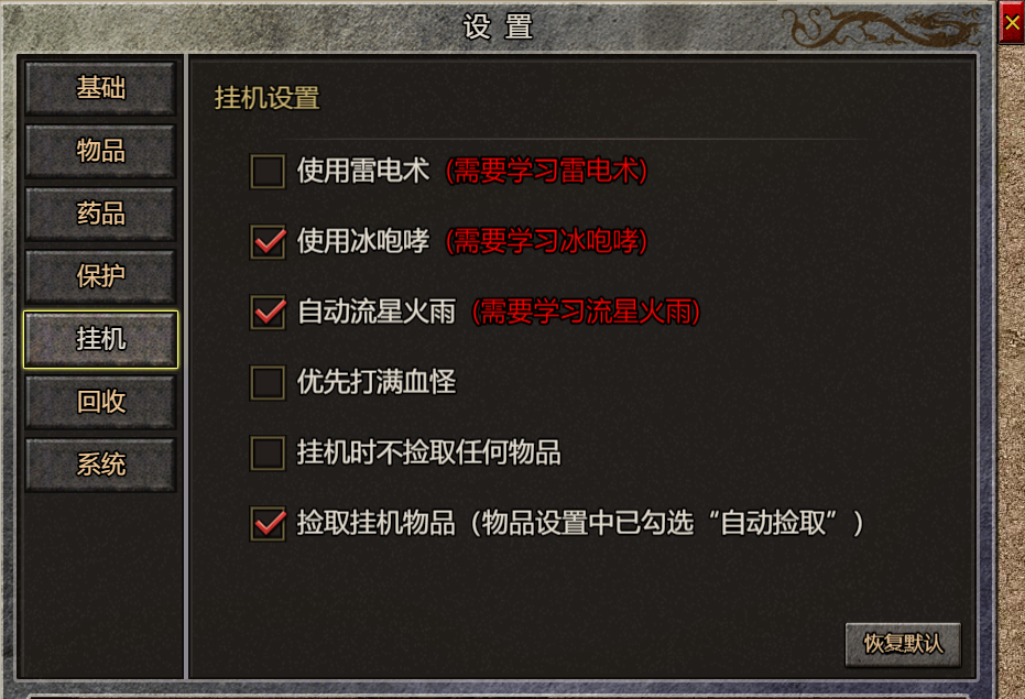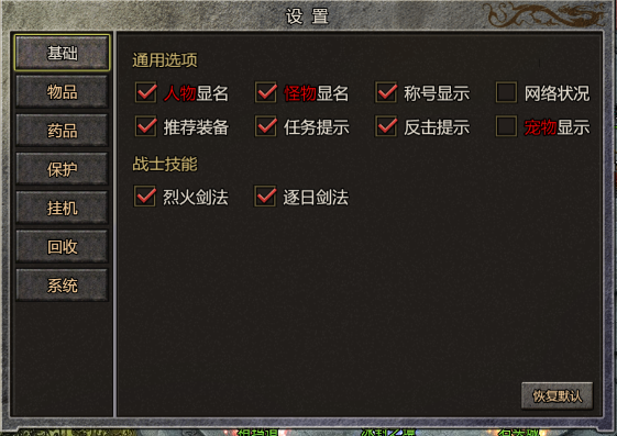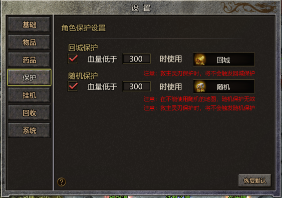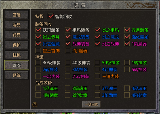 (1)游戏设置功能包括【基础】、【物品】、【药品】、【保护】、【挂机】、【回收】、【系统】设置