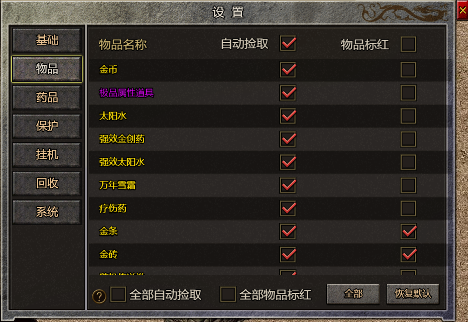 (3)界面下方的全部自动捡取和全部物品标红可以直接对所有物品进行设置调整,避免对每一个物品打勾的麻烦