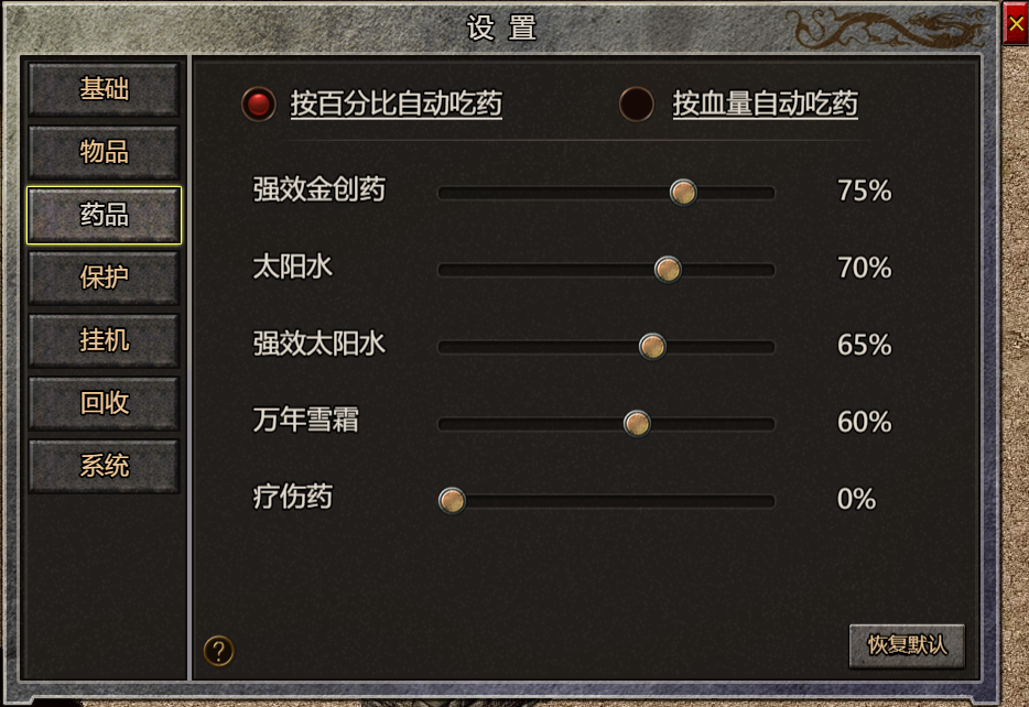 (2)按百分比自动吃药强效金疮药间隔为1秒,太阳水、强效太阳水、万年雪霜、疗伤药间隔为0.6秒