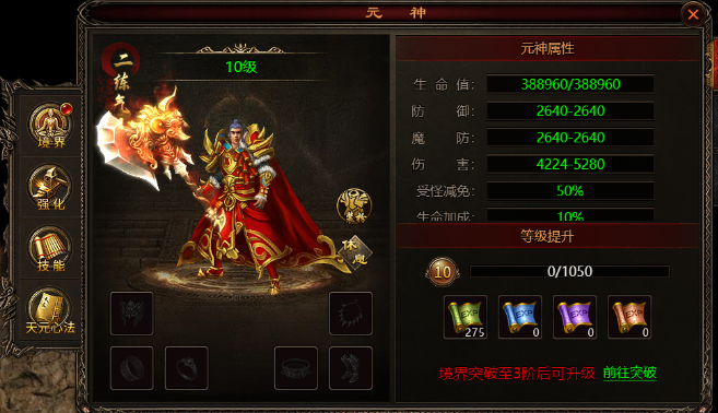 3.境界突破:元神分身可以进行境界突破,突破成功后,可以提升升级上限并获得大量百分比属性加成。