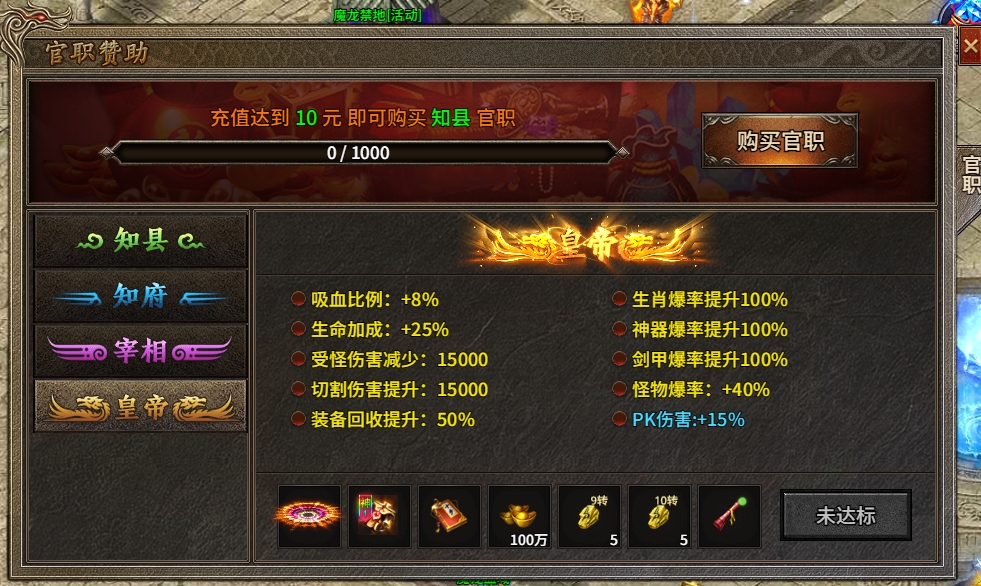 赞助特权:将赞助开至皇帝级别,提升爆率和属性,增加PK伤害。