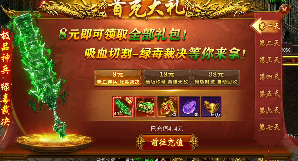 首充8元即可获得神秘赞助和全民赞助礼包,这些首充礼包包含了如绝版神兵、合击秘籍、VIP等级等福利..这些都是在服务器里获得领先优势的重要游戏资源。