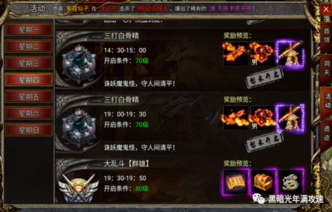 刷装备:每天的三打白骨精活动是一定不能错过的,有很大几率能刷出来好装备。其次就是在龙域了,低战可以去神域,同样也能刷装备,记得打越级BOSS一定开启移动刺杀,不然很容易被怪打死。
