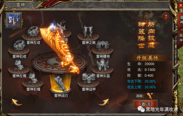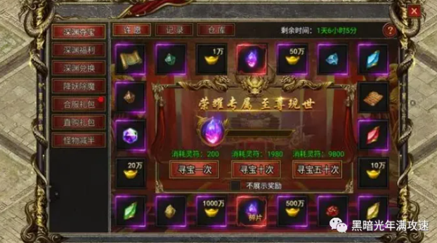 深渊夺宝活动也是一种获取雷神装备的途径,通过抽奖获得黑暗宝玉,可以用来兑换雷神装备部位。雷神战刃和雷神战甲需要75个黑暗宝玉,而其他部位的装备只需要15个宝玉。