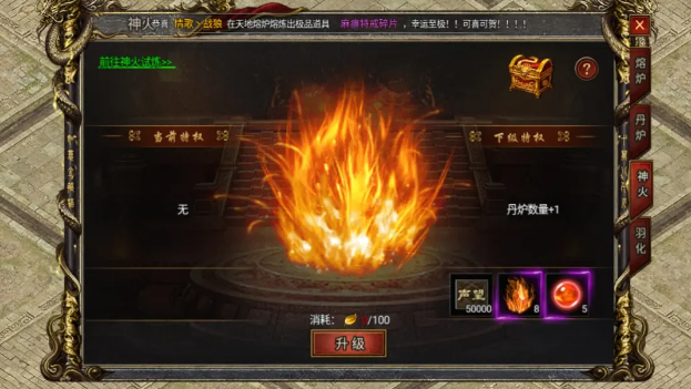 丹炉等级越高,炼制效率也会相应提升。为了提升丹炉的等级,玩家需要准备大量的金精石材料。这些金精石可以通过升级神火来获得,是提升丹炉等级的必备材料。