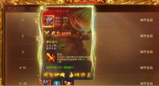 跨服皇城战活动:参与该活动并根据个人排名和达标奖励领取碎片,随后可合成重伤戒指。