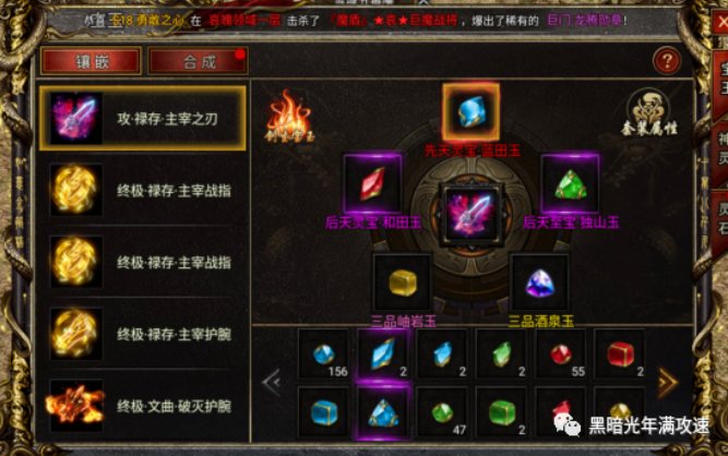 每件装备都可以镶嵌五颗宝玉,装备的宝玉槽需要通过天工锥来开槽才能放入宝石,天工锥主要通过VIP任务和商城来获取。宝玉可以由低阶合成高阶,等级越高合成所需的宝玉和元宝越多。