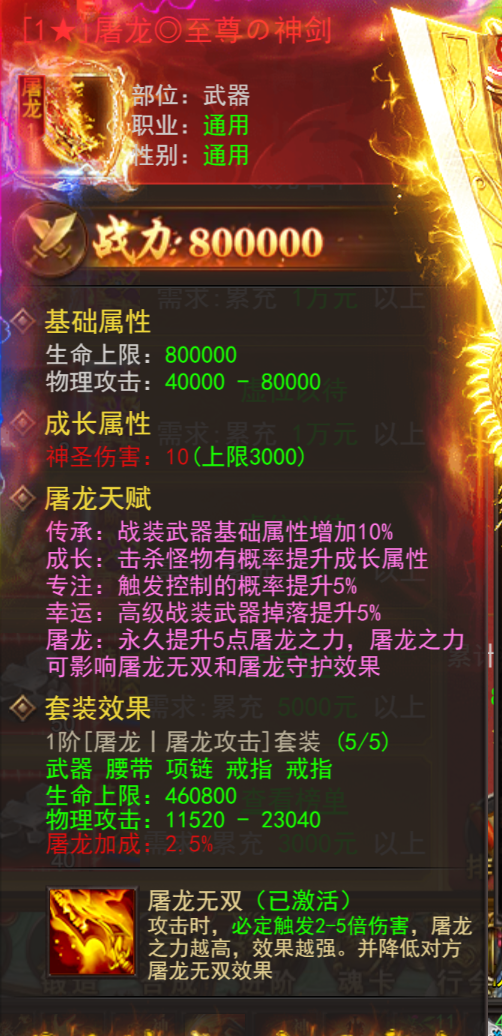 屠龙之力:随着屠龙之力的提升,增加攻击、防御和生命值,对低实力玩家产生压制效果。