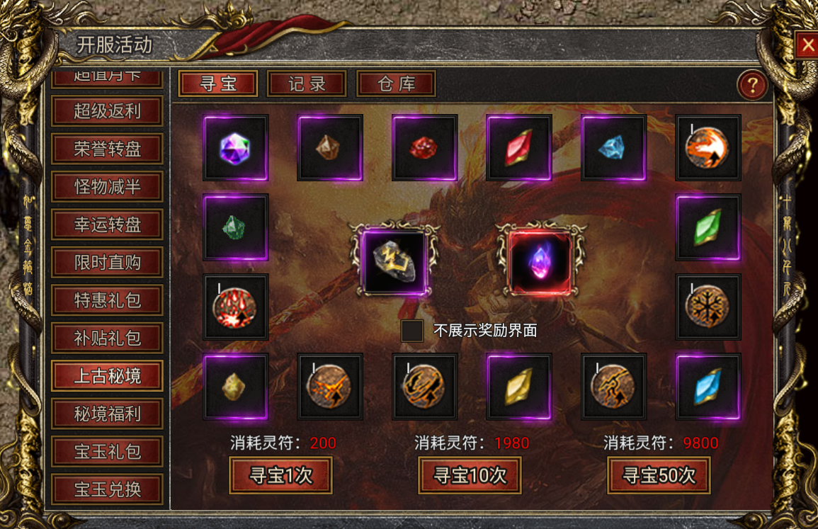首先进游戏后小退一下,然后再进游戏点随机石,不用管随机到哪,之后再直接点开上古秘境活动。先抽5次十连抽,再抽22次一次的,抽到之后从仓库取出放进背包里。