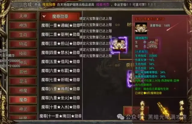 玩家可以在第三大陆的西游秘境地图找到NPC“造神”,提供相应的装备材料便可以进行装备融合操作。魔尊装备主要提供基础属性和元素属性两类属性,不同的装备会具有不同的属性效果,玩家可以根据自己的需求选择适合自己的装备进行融合。