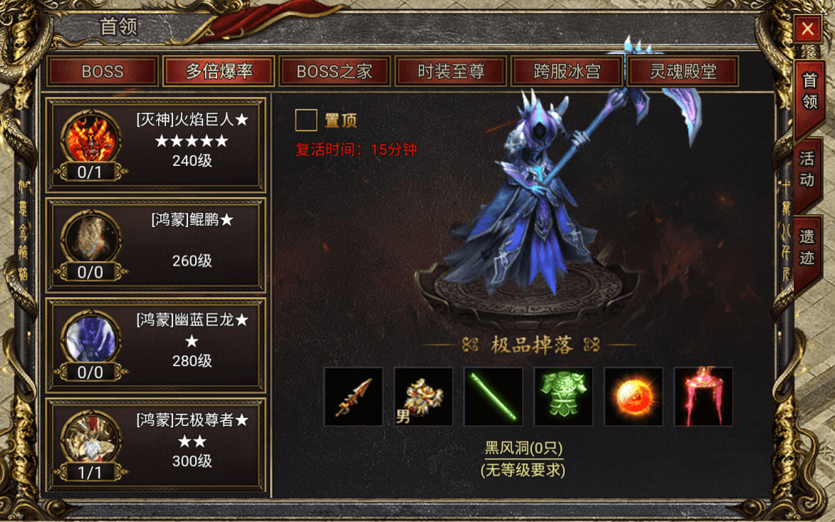 玩家可以通过界面上方的“首领挑战”图标,快速进入多倍爆率BOSS的介绍界面,掌握各只BOSS的刷新情况。这一功能让玩家能够迅速了解BOSS的动态,提高寻找和挑战BOSS的效率。