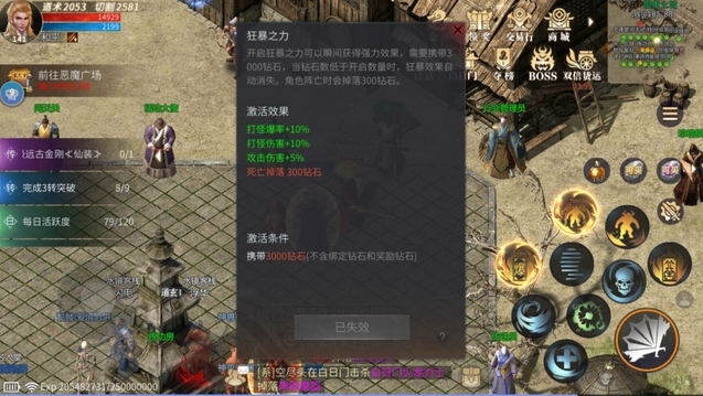 激活狂暴之力可以为你提供额外的10%爆率。虽然不需要特殊材料,但需要消耗3000钻石(不包括绑定钻石和奖励钻石)。请注意,狂暴之力带有负面效果,角色死亡后会掉落300钻石。这是一种高风险高回报的选择。