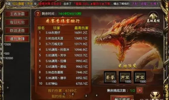 排名:系统记录玩家每次挑战对怪物造成的伤害,并进行排名。赛季排行榜上只会出现本次活动的最高伤害记录。