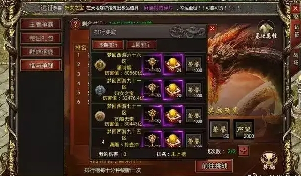 奖励:每赛季最后一天22:30后根据伤害排行发放排行奖励,如元初金丹、大量荣誉值等。挑战BOSS过程中可能还会获得荣誉、声望等其他奖励。