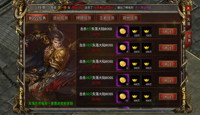 1. **BOSS任务**:挑战并击杀失落大陆上的BOSS,每完成一个任务,你将获得失落币和元宝作为奖励。