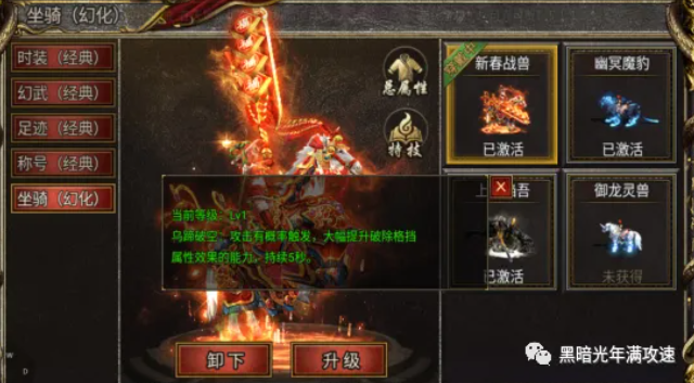 坐骑幻化相当于坐骑的时装,拥有时装幻化必须先获得坐骑,每个坐骑的时装幻化都相当于多了一个属性技能。并且不论有多少坐骑幻化,属性都是可以叠加的。