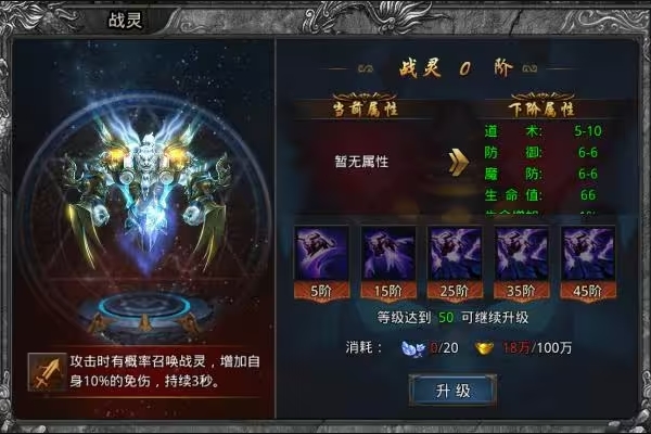 开服天数达到20天后,战灵系统将开启。玩家可以获得战灵,它在与攻击方战斗时可以被召唤,召唤成功后能额外提升自身属性。通常,20个战魂石可以唤醒战灵。声望商店可以购买战魂石,但每天限购30个,因此玩家在声望数量足够时应及时购买。
