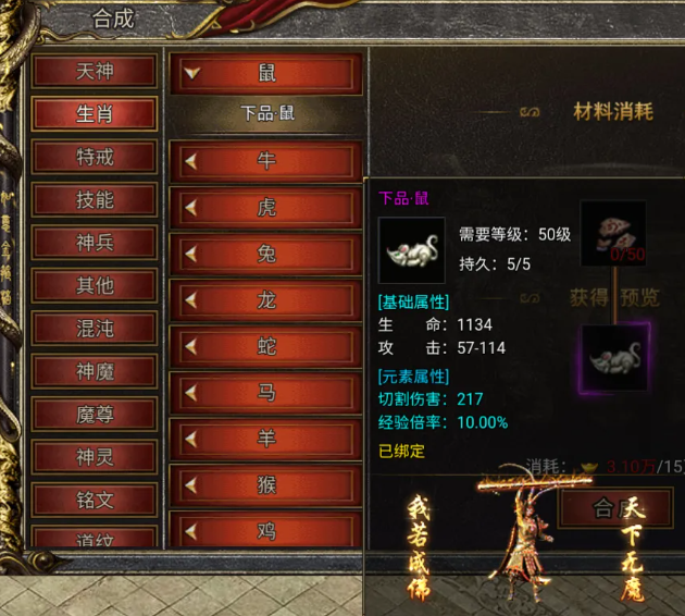 其次还可以获取生肖装备,生肖鼠的元素属性是提升经验倍率,享10%的经验加成。其他生肖装备也是各有各的属性提升,大家可以按照需要入手,生肖每天可以购买三个。