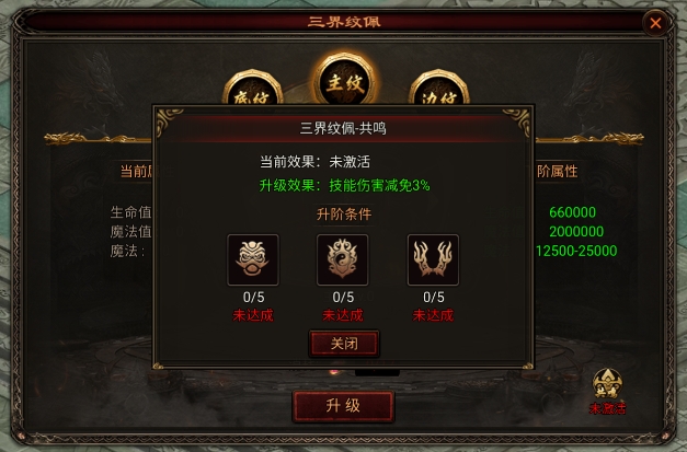 三界纹佩系统在开服40天后激活,它由主纹、边纹和底纹三个部分组成,是中期提升角色属性的关键点。通过升级纹佩,玩家可以大幅增加生命、魔法和攻击力。