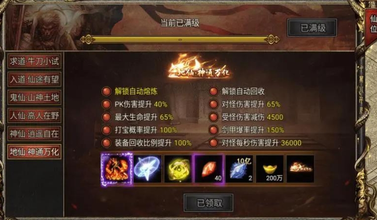 大佬玩家可以直接开启地仙,享受更高的爆率和PK伤害加成。