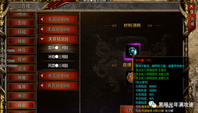 三相铭文可以用特殊铭文石来合成,合成一个一级的三相铭文需要15个特殊铭文石,特殊铭文只有分解高级铭文比如异变铭文才能获得,分解一个异变只能获得一个特殊铭文石或者就是使用黑暗宝玉兑换,无论那种方法都是需要钞能力啦!