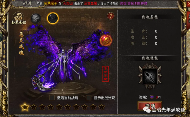 使用【战魂精元】可以提升战魂星数,每满十星就可以进阶到下个阶级。提升战魂等级可以大量提升攻防血三大属性。