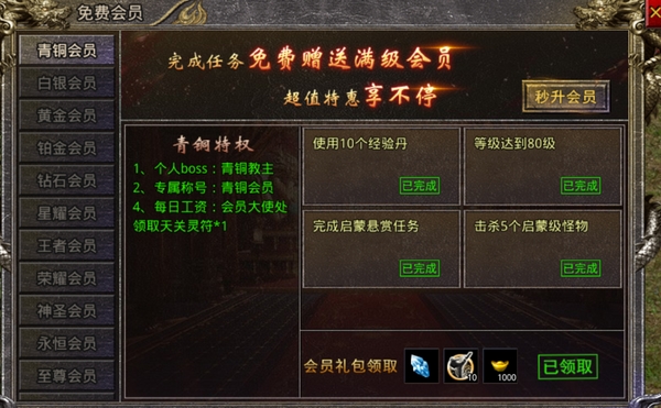中小R玩家:完成主线任务至青铜会员后,充值30、50、100、500档位,获得小精灵节省捡装备时间。剩余灵符购买时装和幻武,提升会员等级。