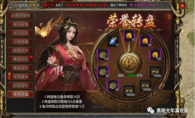 在白蛇传奇游戏中荣誉转盘可以获得降妖币、声望以及行会币等。每转一次荣誉转盘需要消耗1W灵符,每日可转10次,每次转取必定获得荣誉值1万。