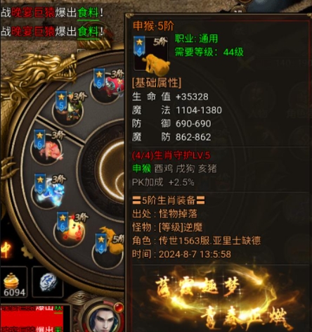 申猴、酉鸡、戌狗、亥猪:激活套装属性,获得PK加成比例属性。