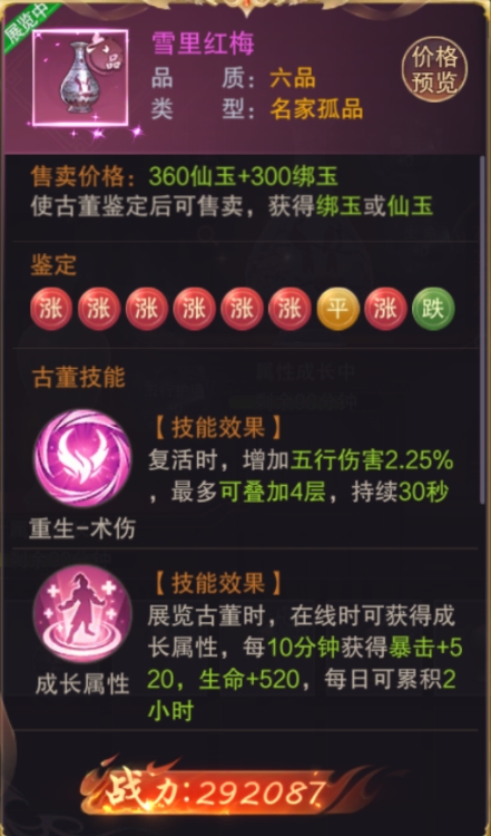 鉴宝展览:根据鉴定结果进行展览,展览期间可获得属性加成,需手动领取后增加到角色上,是提升战力的有效途径。