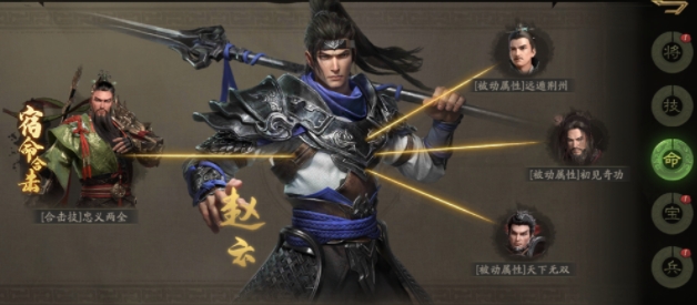 进入游戏后,根据新手指引进行游戏,在升级府邸后,你将面临初始的4对宿命将选择:赵云-关羽、郭嘉-张辽、吕布-貂蝉、孙策-孙尚香。可以根据个人喜好选择,但一旦选定,尽量坚持培养,因为前期集中资源培养一两个武将比平均培养多个武将更为有效。