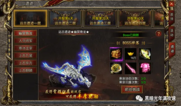 在白蛇传奇游戏中,远古遗迹的每一层都有其特定的开放时间。,每一层的进入时间也在逐渐解锁。开服两天后,大家可以踏入第一层的探索之旅;开服六天后,第二层的大门将为勇者们敞开;而开服20天、60天和135天,将分别解锁第三、四、五层。