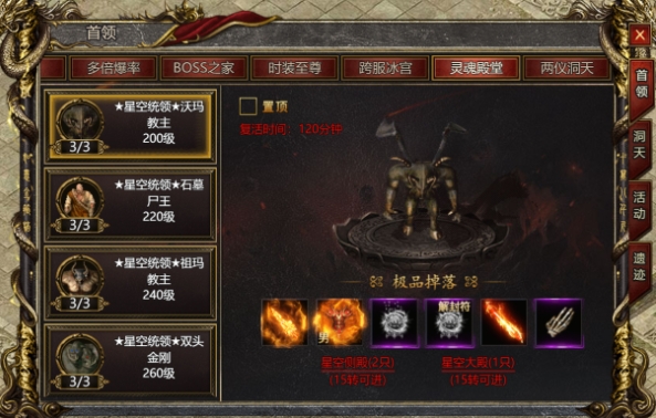 在进入灵魂殿堂之前,玩家可以点击游戏右上角的【首领挑战】按钮,提前查看灵魂殿堂BOSS剩余存活数量和复活时间,以免白白等待。每个BOSS都分布在地图的指定位置。