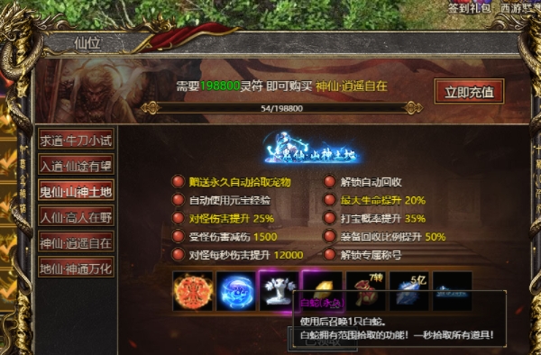 激活【鬼仙·山神土地】的仙位,领取白蛇(永久)的自动拾取功能,快速拾取道具,节省时间。